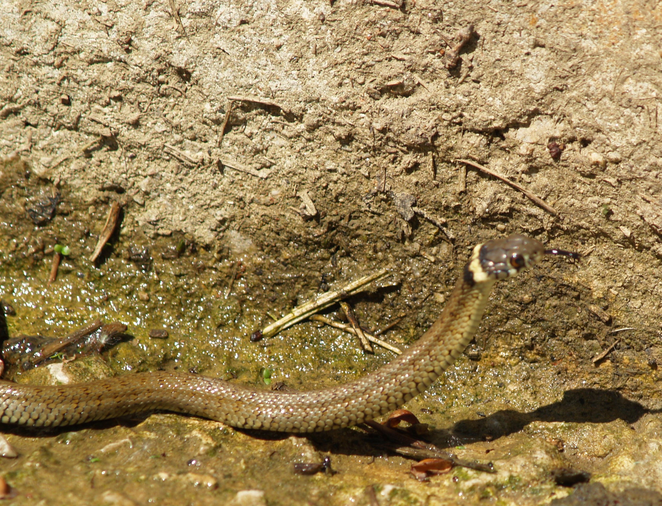 The little one I saw was just a baby, maybe 15-20cm in length. Hatchlings are independent the minute they hatch, so this one was maybe a day old or so (hatchings are between 14-22cm). It was attempting to climb up into a water trough along the road (where cows stop to drink) … in the water trough was food, an plenty of it … I saw maybe 50+ tadpoles and around 20+ newts (Palmate Newt – Lissotriton helveticus). Anyway, these fall smack in the diet of hatchling Grass Snakes!