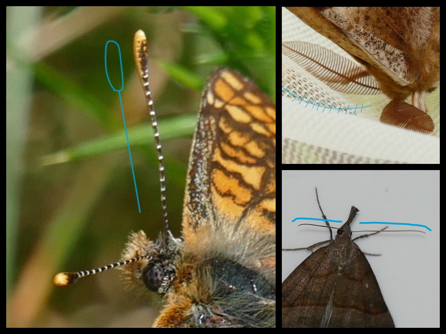 Butterflies have little clubs at the end of their antenna, whereas moths have straight or feathery antenna (see Fig. 1).